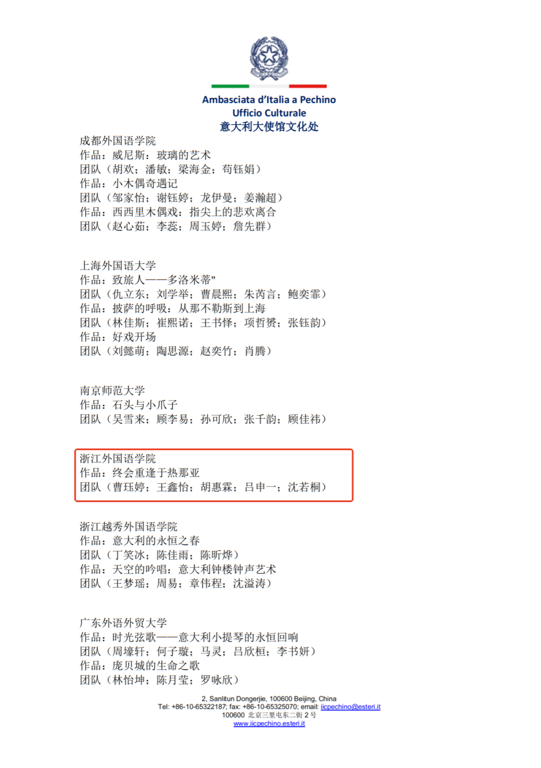 此次获奖既是对我院学生专业能力、创新意识与团队协作水平的充分肯定,更彰显了我院意大利语专业 “语言+传播”的复合型人才培养效果显著,为助力推动中意文化互鉴走向更深层次、更宽领域贡献西语力量。
