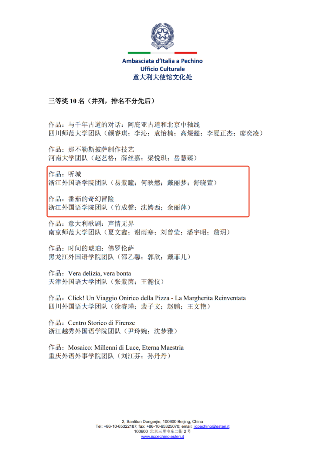 我院选派3支学生团队参赛,其中,22意语1班易紫瞳团队作品《听城》(指导老师:马素文)、22意语1班竹成馨团队作品《番茄的奇幻冒险》(指导老师:胡健文)获三等奖;23意语1班曹珏婷团队作品《终会重逢于热那亚》(指导老师:杨和晴)获优秀奖。