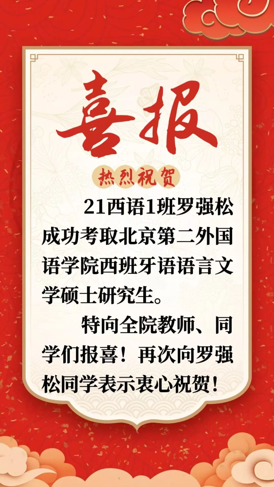 荣誉喜讯 | 21西语1班罗强松成功考取北京第二外国语学院西班牙语语言文学专业硕士研究生(25年国内升学第8期)