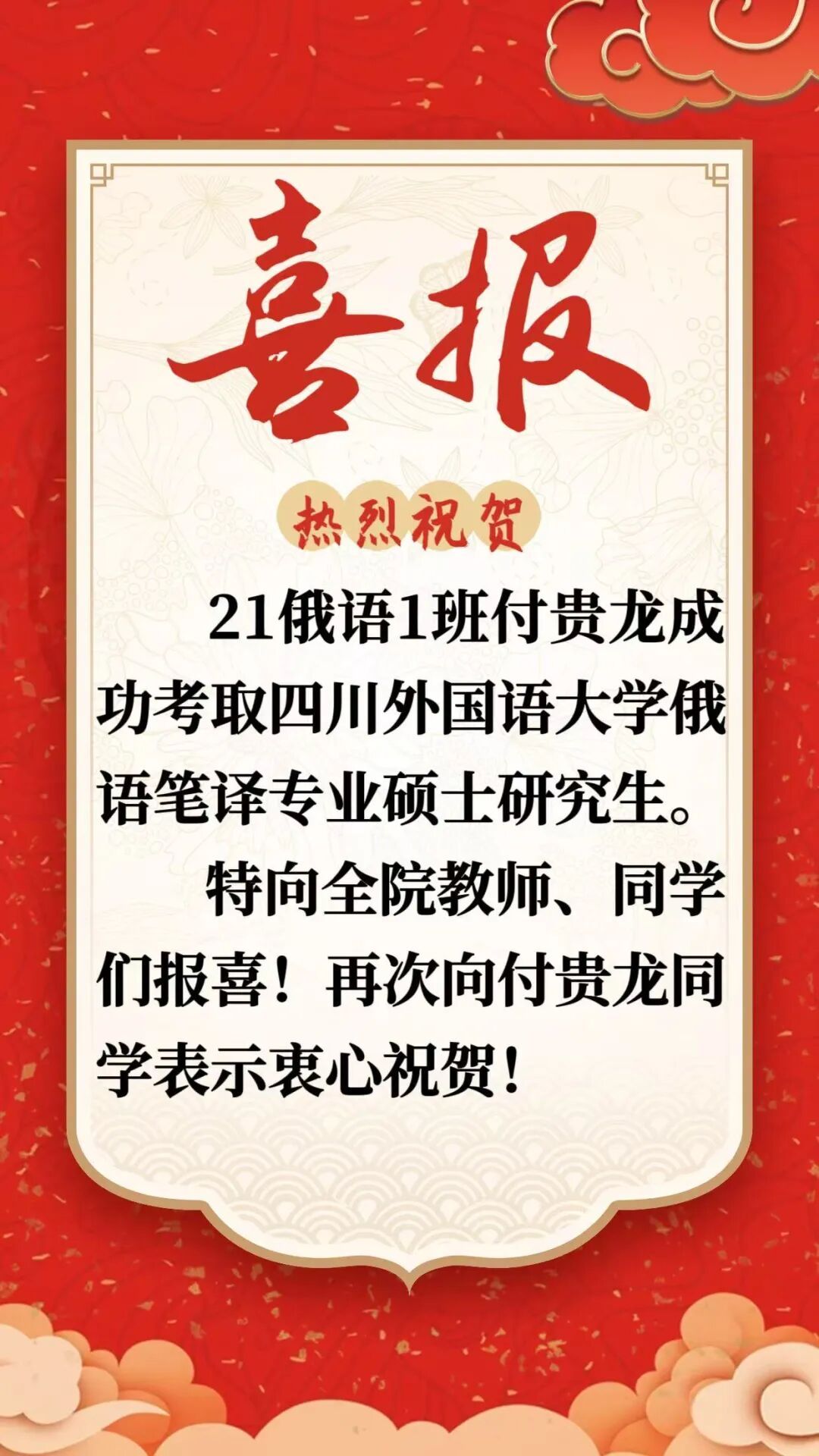 荣誉喜讯 | 21俄语1班付贵龙成功考取四川外国语大学俄语笔译专业硕士研究生(25年国内升学第6期)