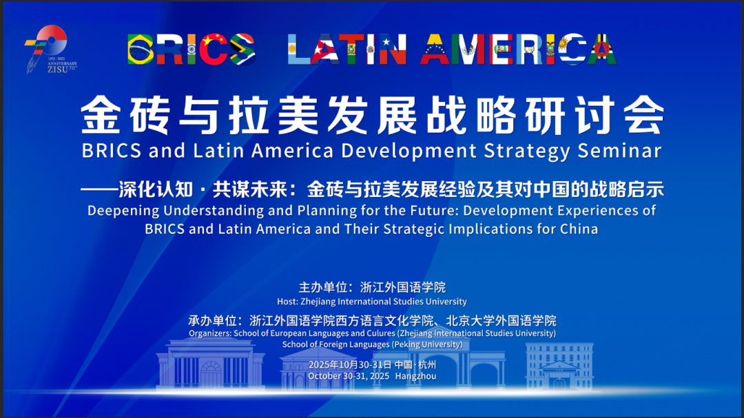 为深入贯彻落实我国对拉丁美洲和加勒比地区合作战略部署,服务金砖国家合作机制高质量发展,推动我国与拉美地区在百年未有之大变局背景下深化战略对接、政策协调与发展协同,浙江外国语学院拟于2025年10月31日(周五)举办“金砖与拉美发展战略研讨会”,此次会议由浙江外国语学院主办,浙江外国语学院西方语言文化学院、北京大学外国语学院承办。